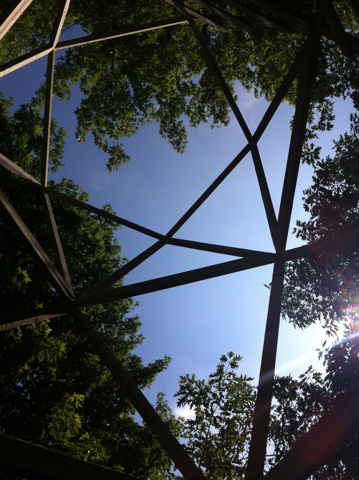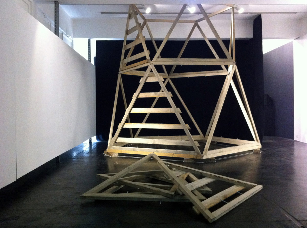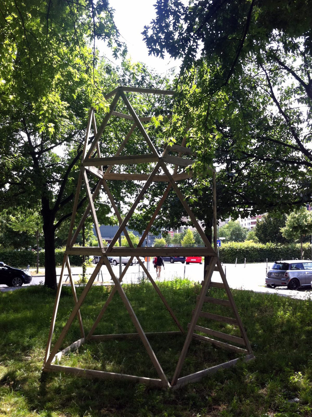 For Essaying Performative Constructions, Malin Arnell, has created a gigantic architectonic scaffolding. On the day of the opening, on the lawn outside the gallery, she together with Clara López Menéndez with the help of audience will erect an accessible five-meter-high wooden tower made from pre-fab triangular modules: a mixture of jungle gym, viewing platform, perch, and watchtower. The construction will be disassembled on the following day and rebuilt in altered form in the exhibition space. In Arnell’s installation, the basic form of the triangle is associated with the modular construction of Buckminster Fuller’s Geodesic Domes, but also with symbols such as the pink triangle the Nazis used to identify gay men or the triangles in pentagrams. At the same time, Arnell’s work also incorporates outdoor and indoor space, concentrating not on the finished work of art, but on the process of installment and disassembly, whereby the built construction and the construction of commonality become inseparable.