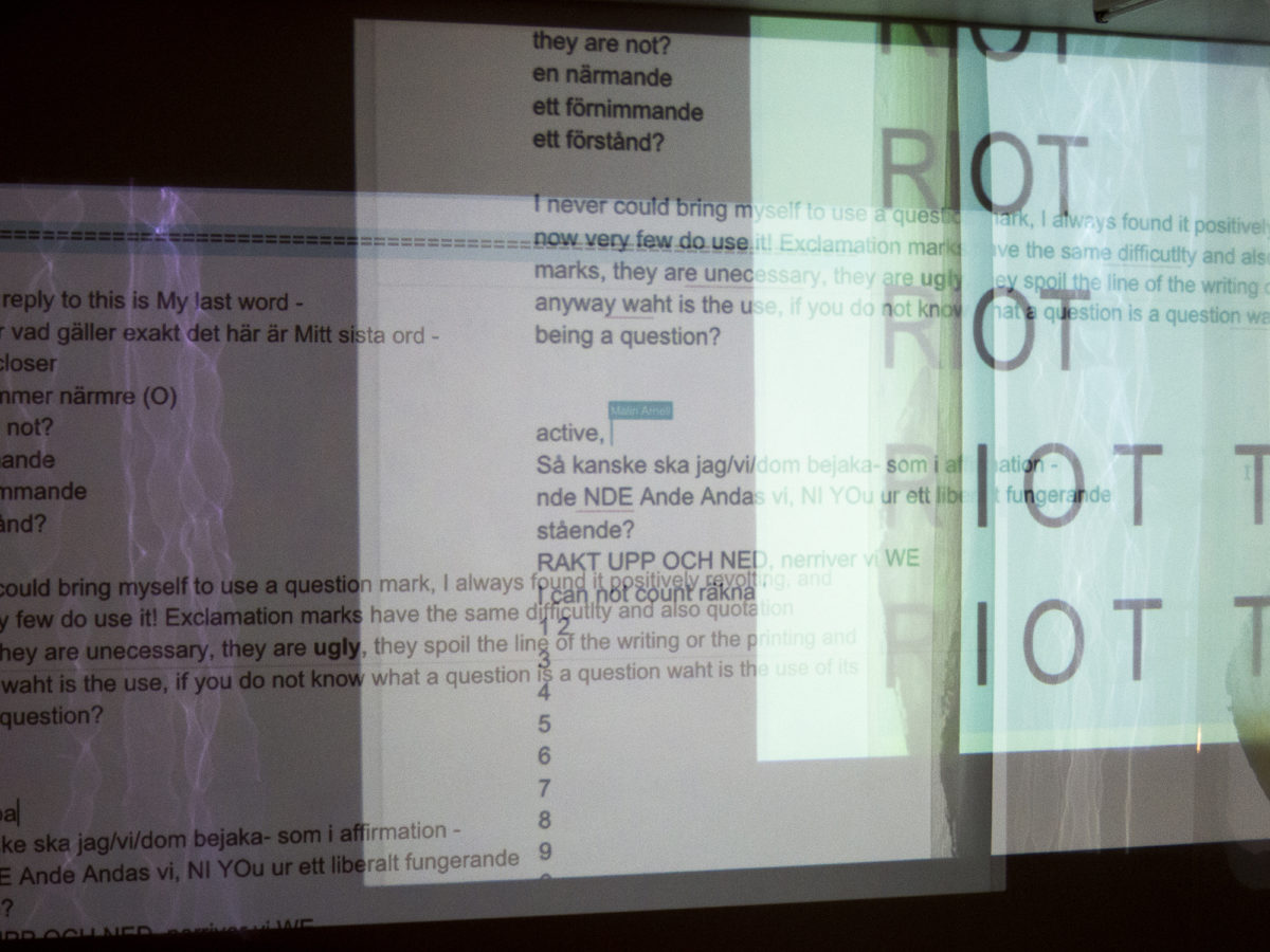 Kapitel, Kaput, Kapital, Kapitulera, Capitulum: header of a text and a part of the arm – a collaboration among others / Kapitel, Kaput, Kapital, Kapitulera, Capitulum: huvudpunkt av en text och en del av armen – ett samarbete bland annat, 2014, Index – The Swedish Contemporary Art Foundation in Stockholm. Curated by Nathalie Åhbeck.