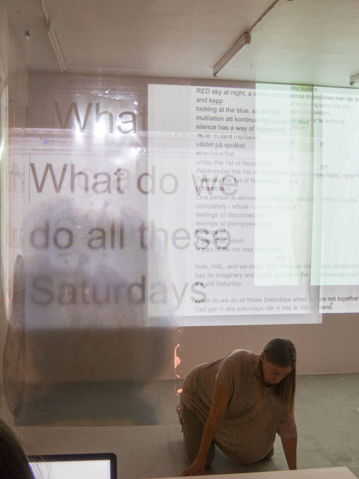 Kapitel, Kaput, Kapital, Kapitulera, Capitulum: huvudpunkt av en text och en del av armen – ett samarbete bland annat / Kapitel, Kaput, Kapital, Kapitulera, Capitulum: header of a text and a part of the arm – a collaboration among others (2014), Förtätning / Densification #2, Malin Arnell, Fia Backström, and Imri Sandström.