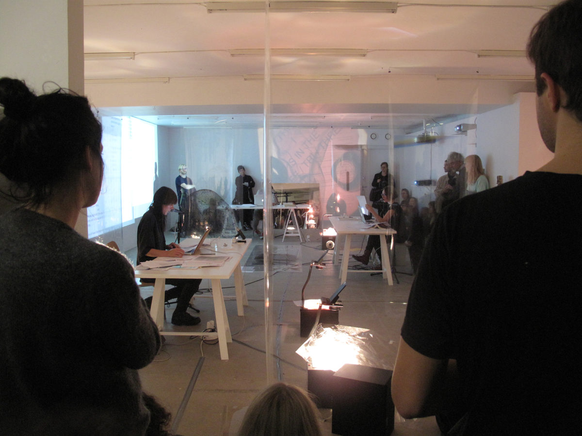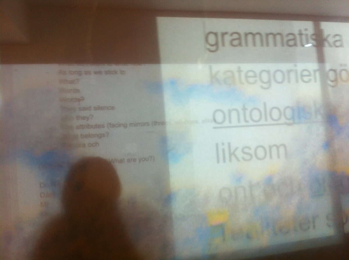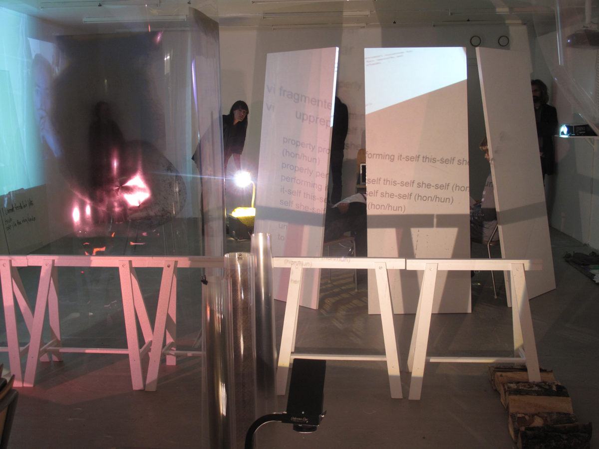 Materialiseringar / materializations: overheadapparater, transparent film, A4 papper, bokstäver / letters, språkljud / language sounds, dagsljus / daylight, glasskivor / sheets of glass och speglar / mirrors samt videoprojektor(er) + (rökmaskin) / (smoke machine), svett / sweat, vågbrus / sound of waves, andetag / breath, tidsrytmer / rhythms of time
