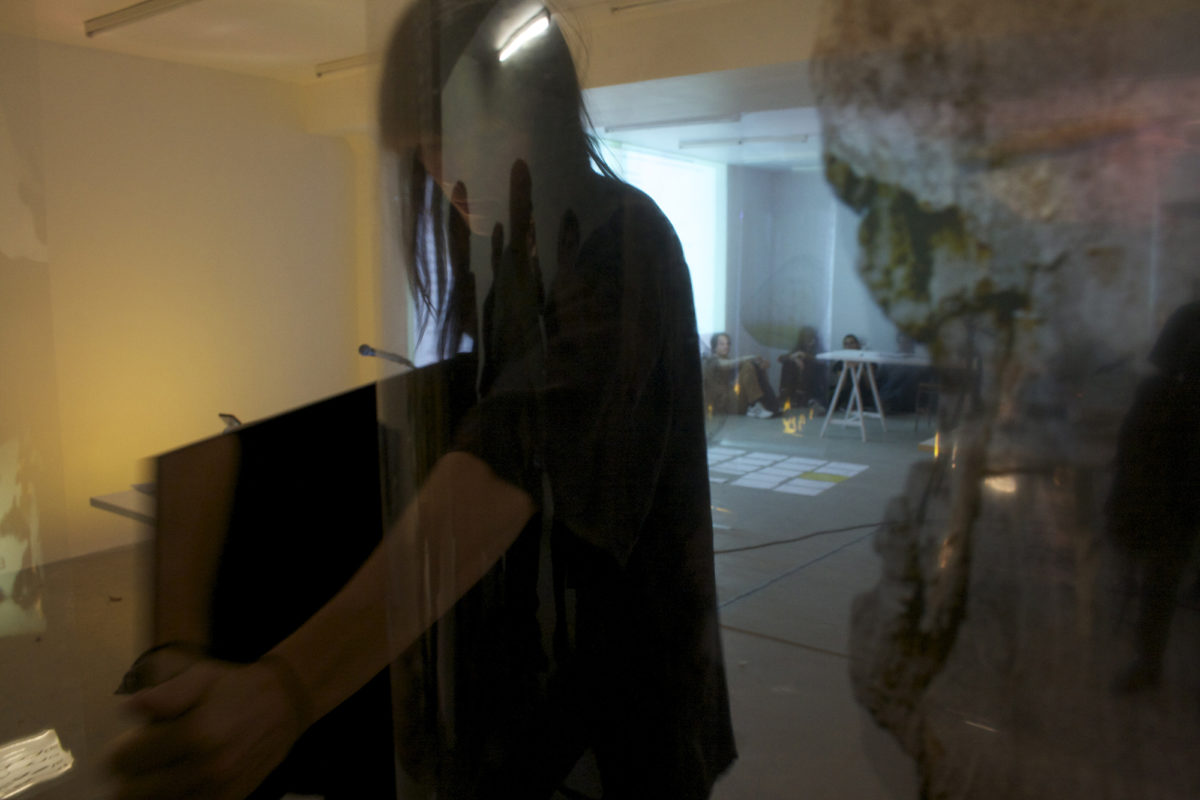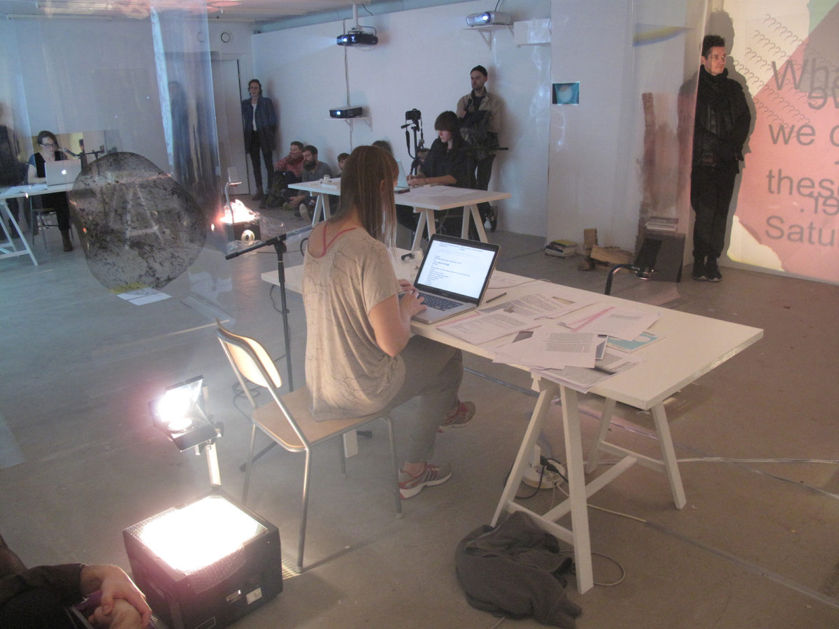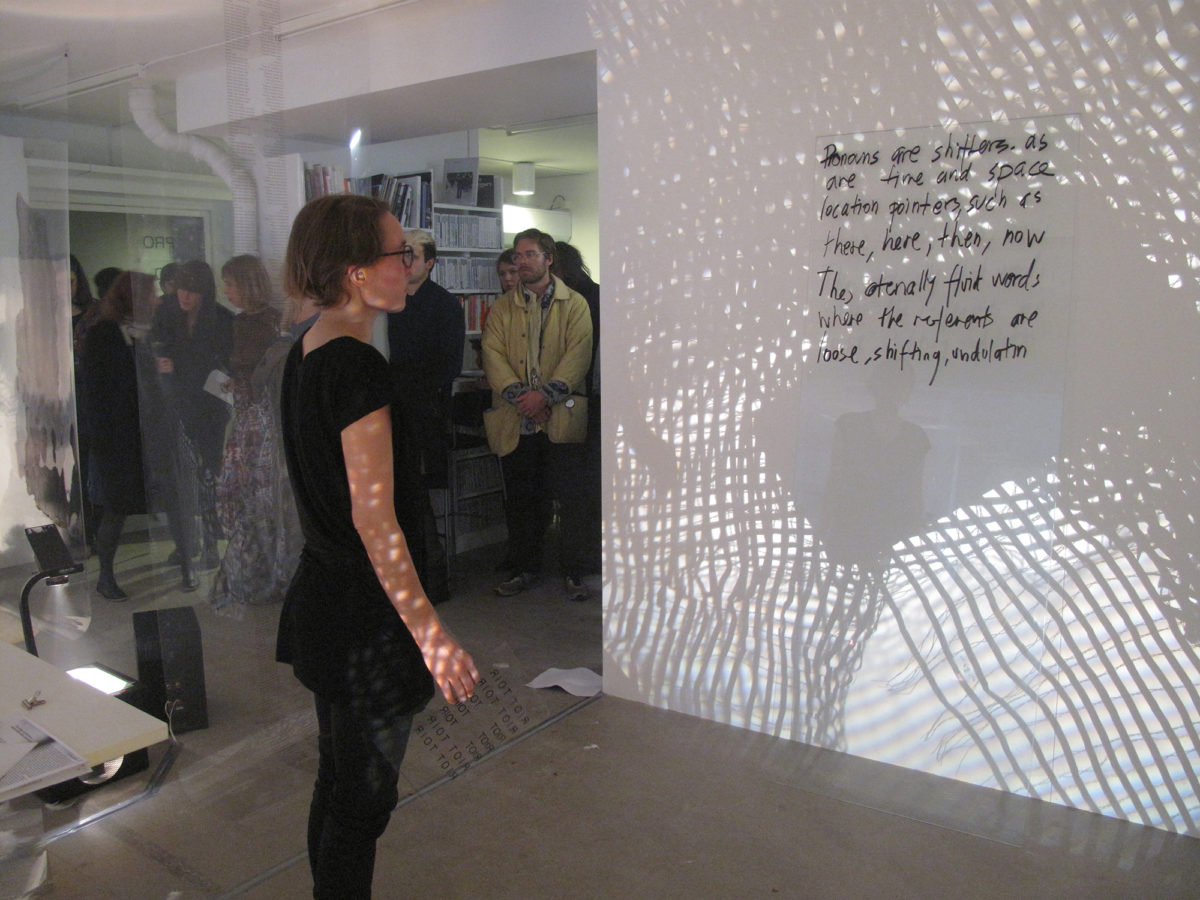 Materialiseringar / materializations: overheadapparater, transparent film, A4 papper, bokstäver / letters, språkljud / language sounds, dagsljus / daylight, glasskivor / sheets of glass och speglar / mirrors samt videoprojektor(er) + (rökmaskin) / (smoke machine), svett / sweat, vågbrus / sound of waves, andetag / breath, tidsrytmer / rhythms of time