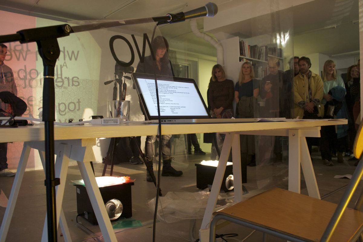 Kapitel, Kaput, Kapital, Kapitulera, Capitulum: header of a text and a part of the arm – a collaboration among others / Kapitel, Kaput, Kapital, Kapitulera, Capitulum: huvudpunkt av en text och en del av armen – ett samarbete bland annat was a joint exhibition by artists Malin Arnell, Fia Backström and Imri Sandström. The artists’ shared desire to understand what is most elemental, and therefore often taken for granted, and the political dynamics that determine the possibilities for participation, forms the starting point for the collaboration. In an attempt to not distinguish between the negotiation, production, and presentation of the work, the gallery is open to the public while the work is in progress.