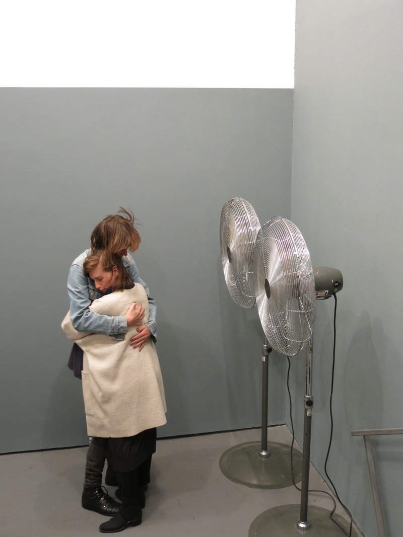 Slow dancing with two fans is a small excerpt from the three-day action, I am not quite sure. This is an arduous terrain (2013). The artist invited gallery goers to slow dance with her during the opening of the exhibition at White Columns, and then at other unannounced times during the run of the show. Two industrial fans were set up at the entrance of the gallery where the dancing took place and the action became the filter through which people entered the space.