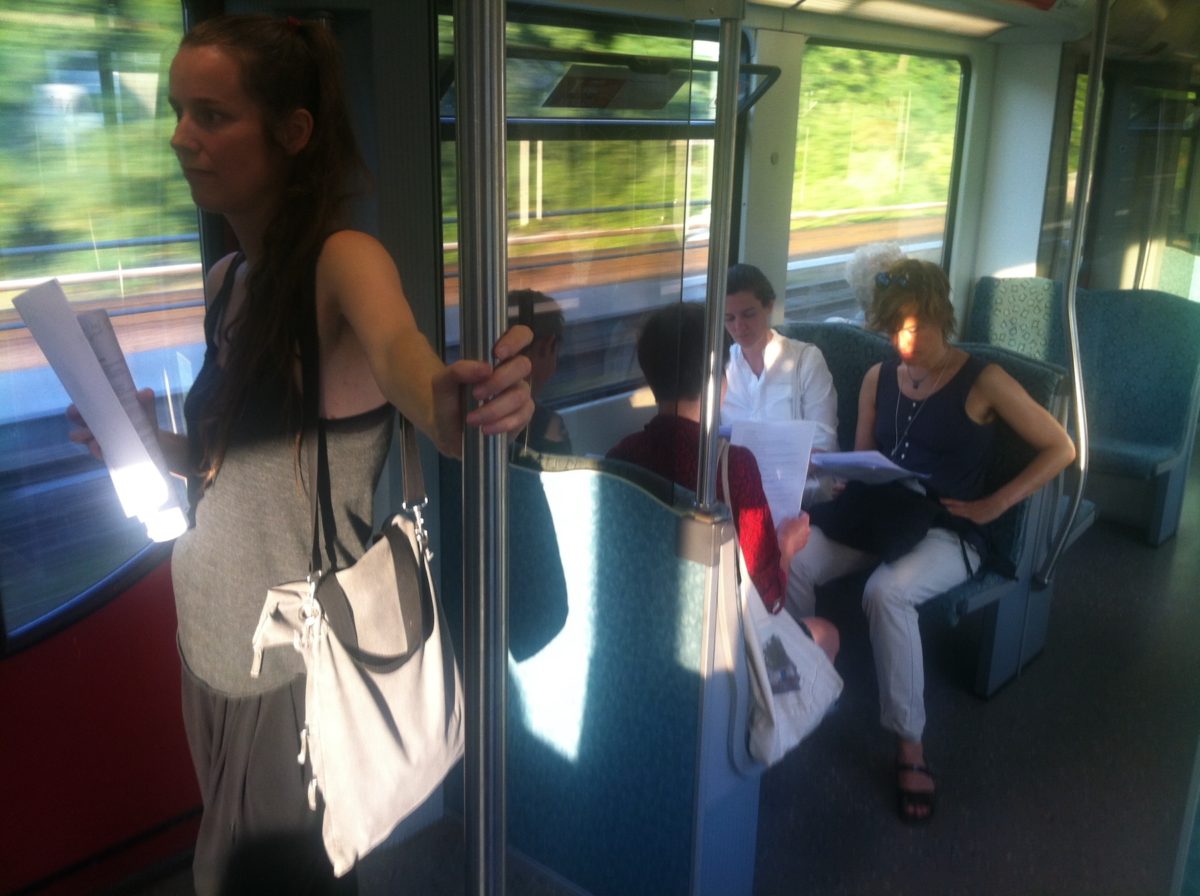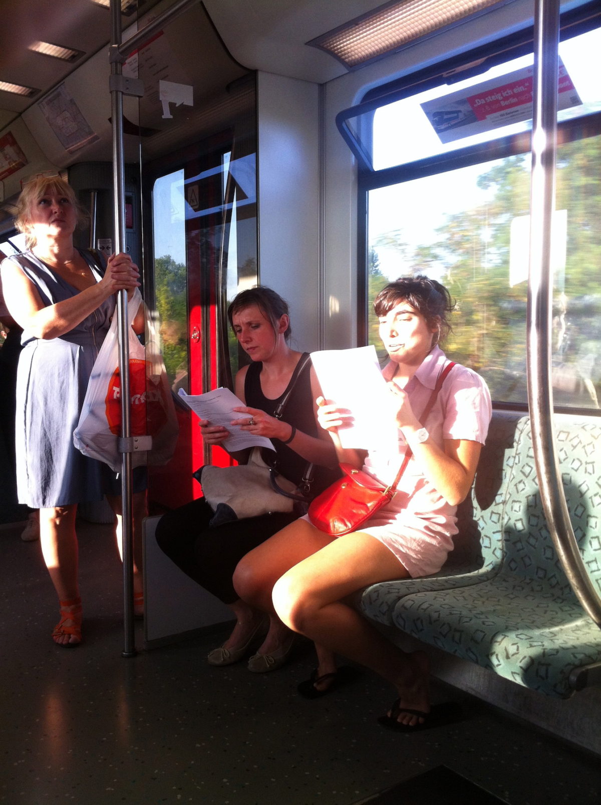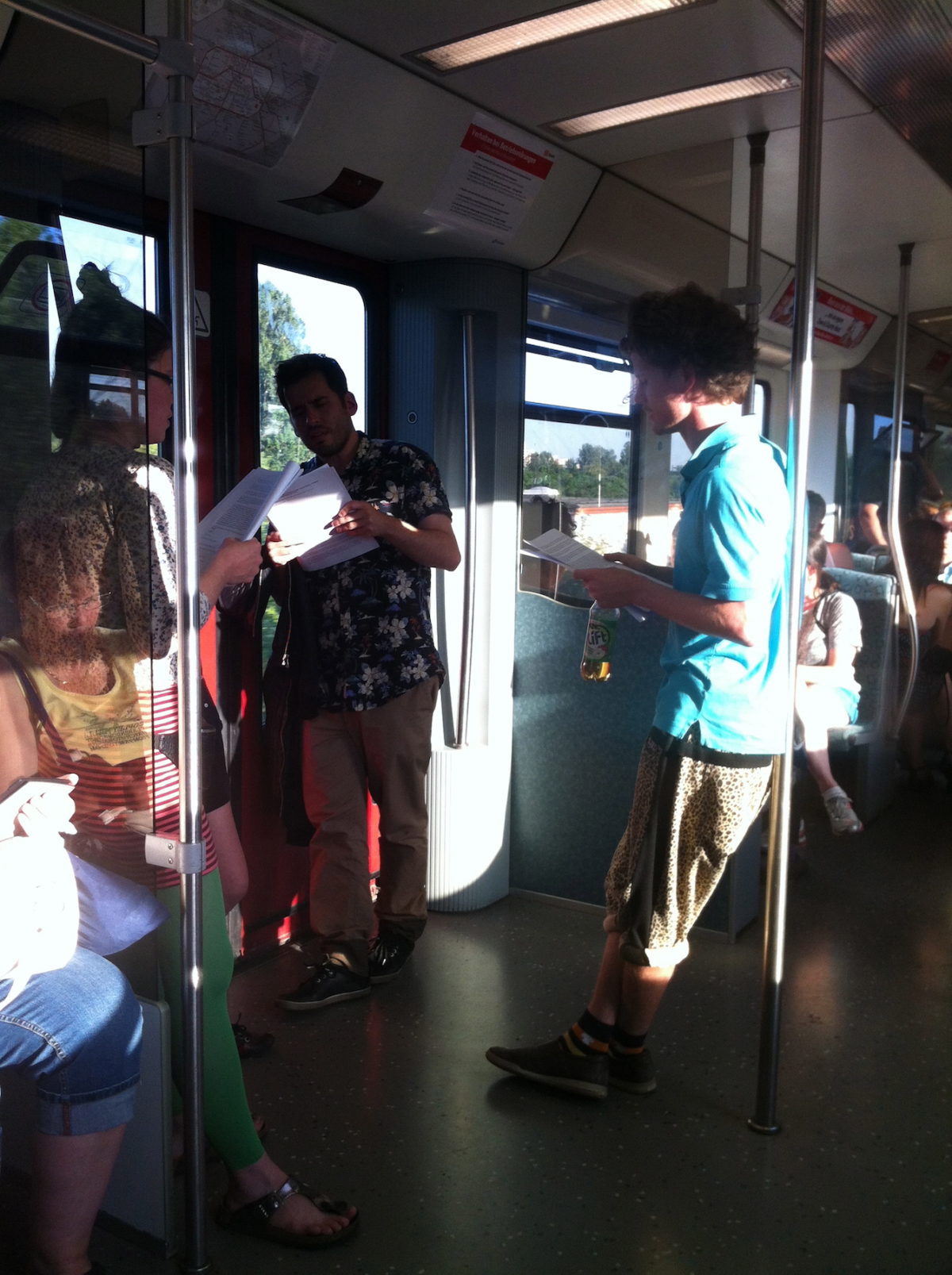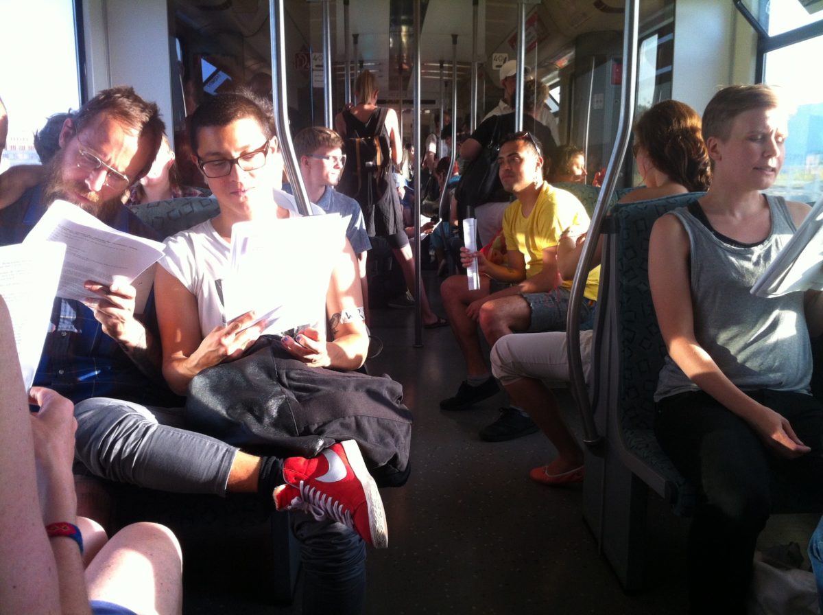 For the WIR SPIELEN (WE PLAY) project, YES! Association / Föreningen JA! extended an invitation to everyone to join on a cyclical trip on the Berlin Ringbahn with Act 5: Zyklische Gesellschaftsreise (2013). A group of over 75 lives travelled collectively and was prompted to engage in the reading of a script by YES! Association / Föreningen JA!. The script was composed of different quotations from texts and aimed at starting a conversation around the desire to make sense of “today” through looking, moving, conversing, and reading aloud.